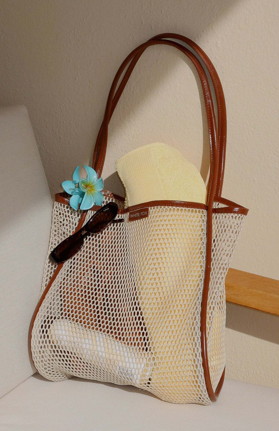 Your new spring essential! The Aria Shoulder Bag Oat features two large shoulder straps, a large tote design, mesh, sheer fabric and gold plate logo detailing. Pair with any of our spring looks for an insta worthy pic!