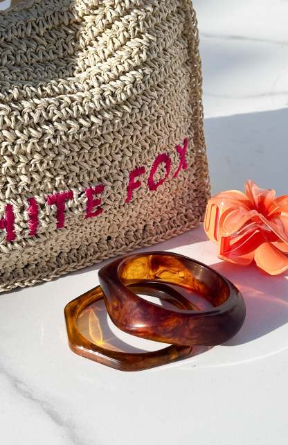 Theres no such thing as over accessorising! The Bodie Bracelet Set Tortoise features a two piece bracelet set, marble pattern and glossy appearance. Embrace your inner maximalist.