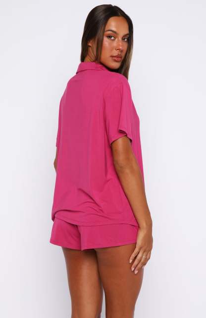 Cosy up in the pyjamas you’ll never want to take off! The Dreamscape Pyjama Set in Berry features a high-stretch, soft fabric and is fully lined for a smooth feel. The top has a relaxed lapel neckline, short sleeves, and a button-front closure. The matching shorts are designed with an elasticated waistband that gives you all-night comfort. Pair with your go-to slippers and drift off into dreamy serenity.