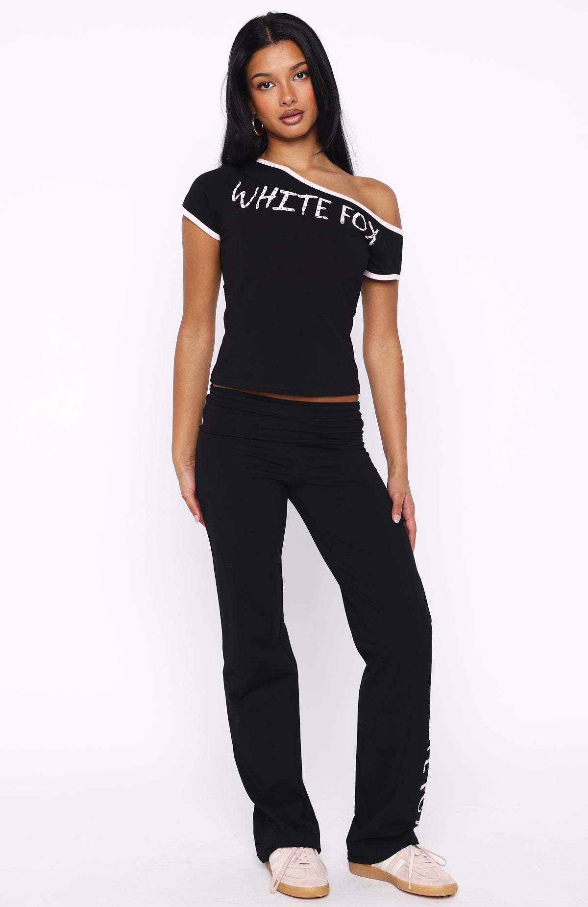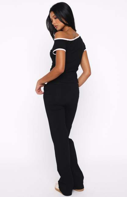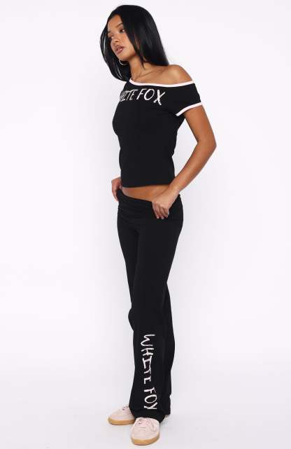 Radiate IT‑girl energy in the Good Things Take Time Straight Leg Pants in Black. These pants boast a thick waistband, a sleek straight‑leg cut, and White Fox text with rhinestone detailing down the sides. Made from high‑stretch fabric and unlined for easy wear, they’re bold yet comfortable. Pair with the matching Good Things Take Time Off‑Shoulder Relaxed Tee in Black to complete the look.