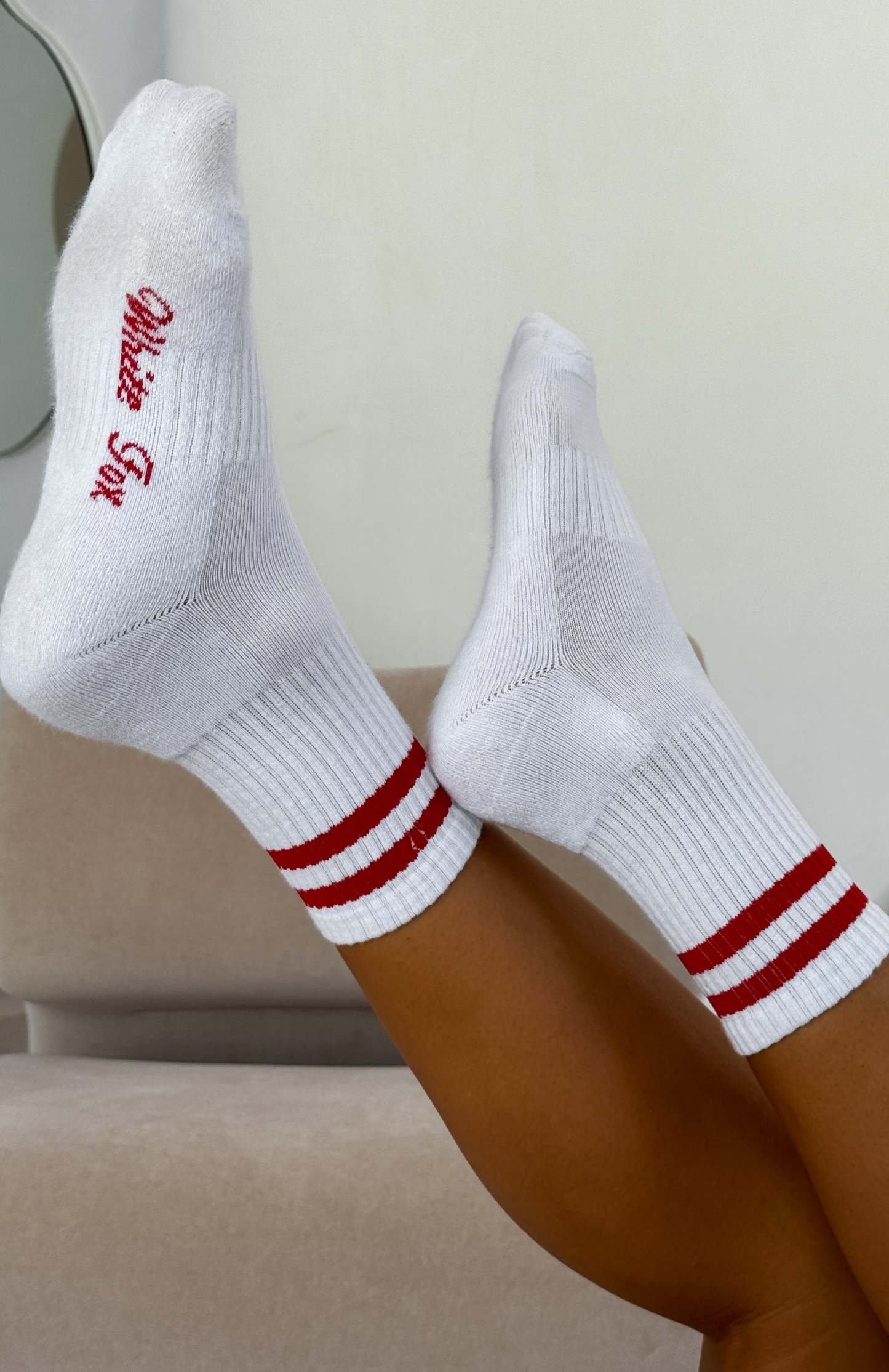 Your hot girl walk outfit isn't complete without the Grounded Socks White/Red! These cushioned crew socks feature embroidered WF Logo with contrast colour detailing and ribbed ankle cuffs and arch band.