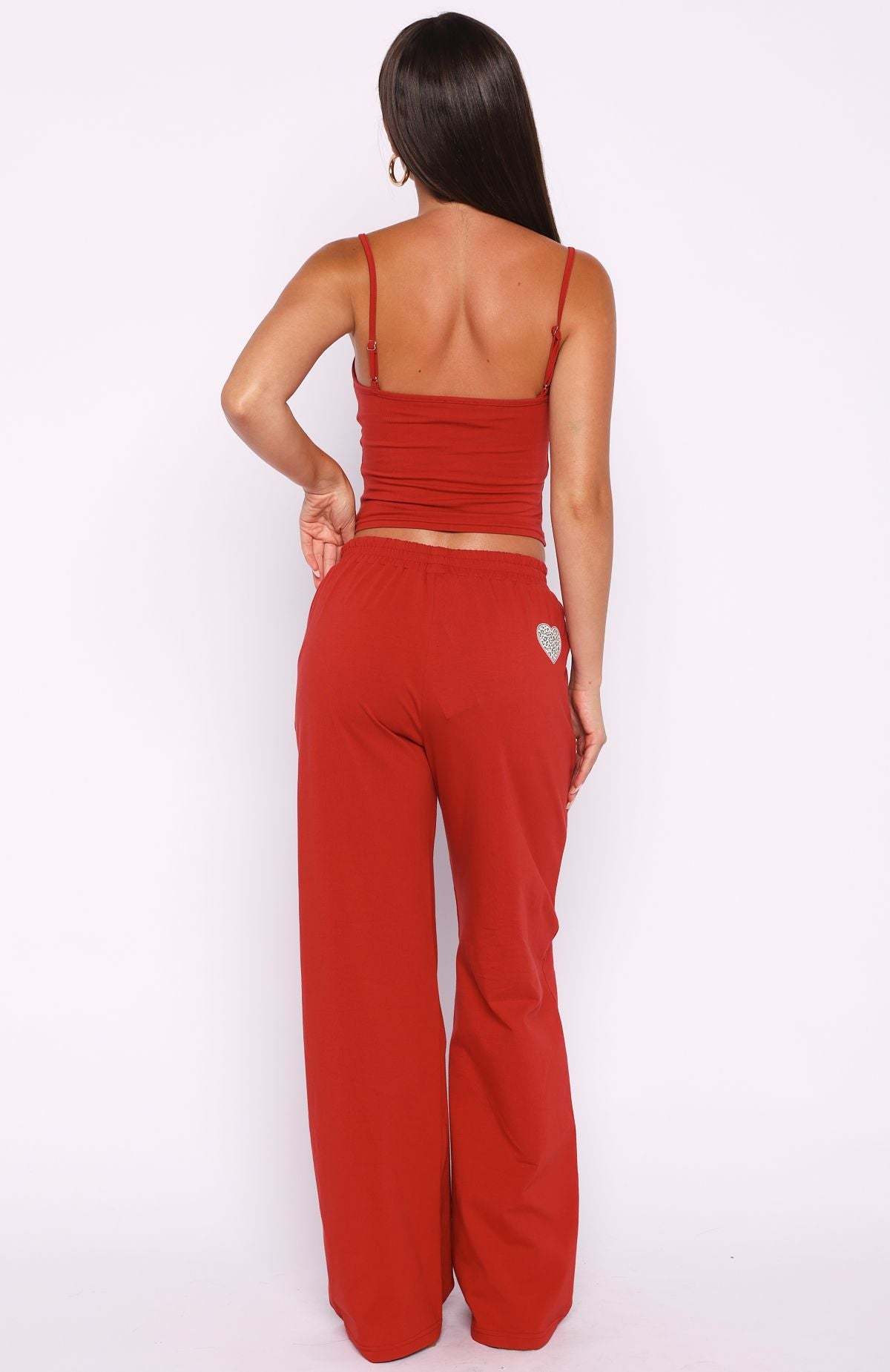 Rock a rebellious vibe with this fun set that's all about attitude. Our Heart Gone Wild Track Pants Red feature a thick, comfy waistband, a wide leg silhouette, high stretch fabrication, and a bold printed White Fox text detailing for a signature touch. Style with the matching Tank Top and chic sunnies for an elevated errands fit.