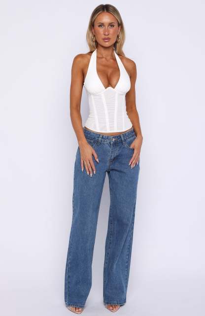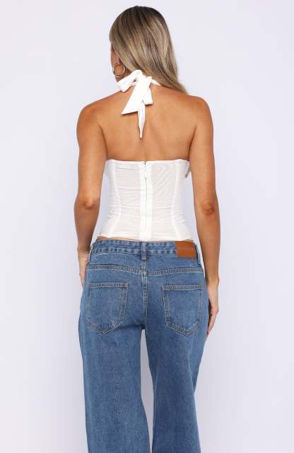 Trending for a reason! The Hot Girl Halter Bustier White features self-tie halter straps, a plunging neckline with underwire-curved detailing, and a fitted bodice that flatters your shape. With internal boning for structure, plus a back zipper with hook-and-eye closure for a seamless finish, this piece combines support with sultry style. Pair it with your go-to denim jeans and kitten heels for the ultimate girls’ night out look.