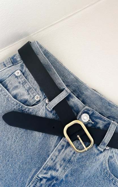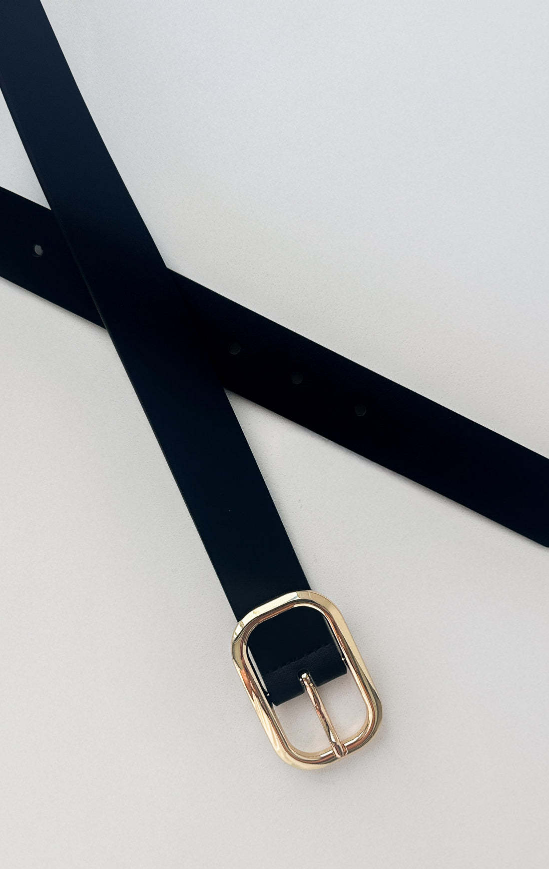 The Kai Belt Black features PU fabrication and fitted with an oval, gold plated hardware buckle. Style with your go-to pair and jeans for a chic and effortless look!