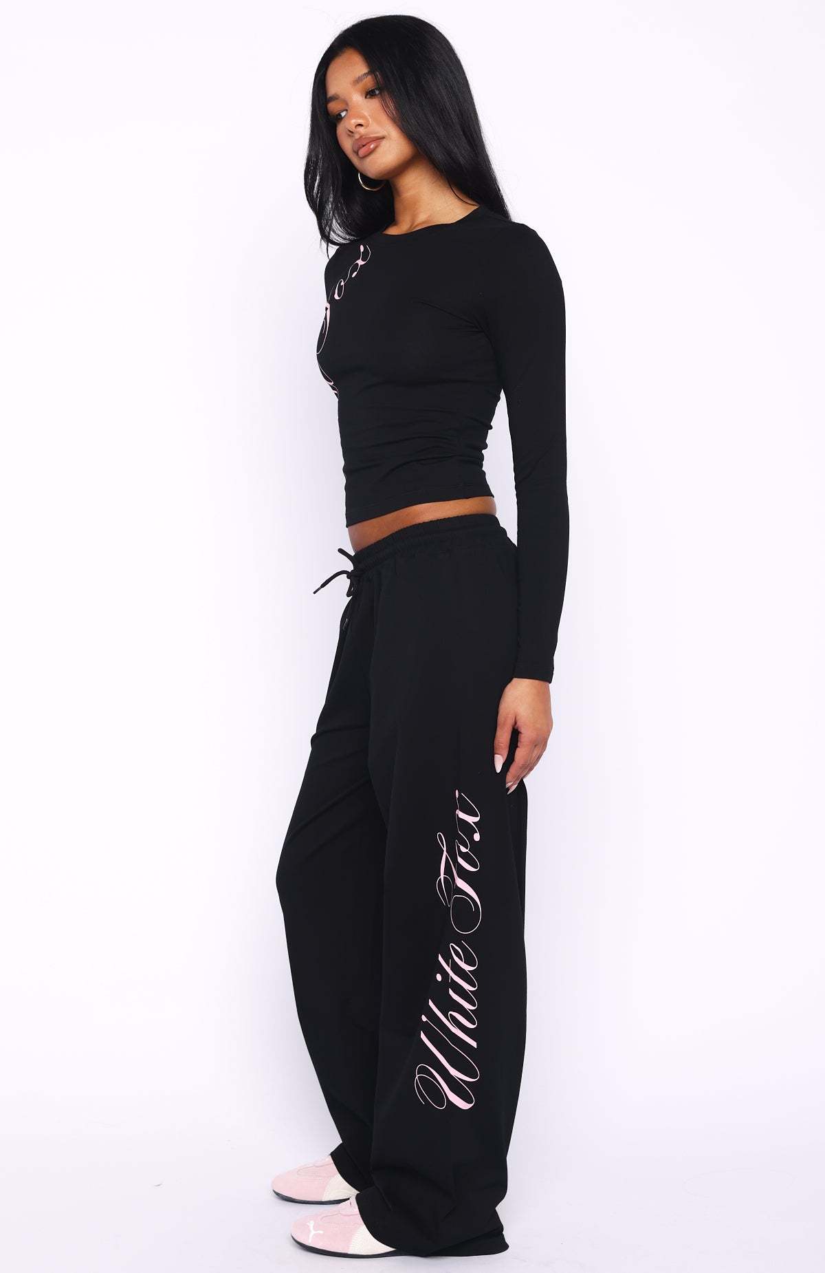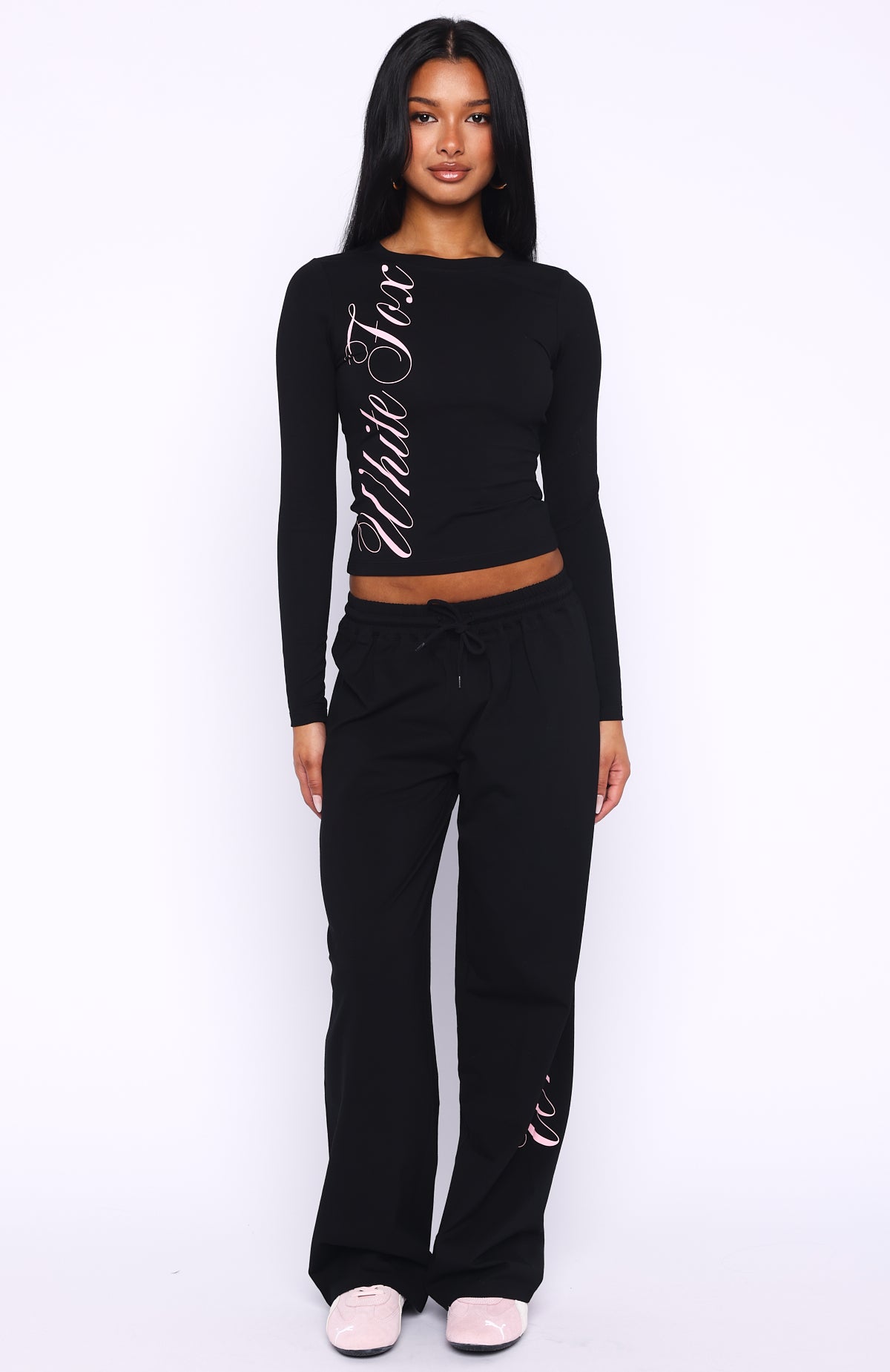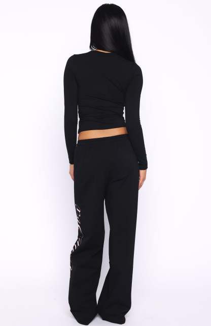 I'm nicer when i like my outfit! The Luxurious Girl Track Pants in Black features a thick elastic waistband with drawstring for an easy, comfy fit. The wide-leg cut and cursive White Fox script down the side add laid-back style. Soft, unlined and perfect for everyday wear. Style with the matching Luxurious Girl Long Sleeve Baby Tee Black for a super cute, cosy look!