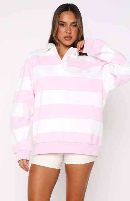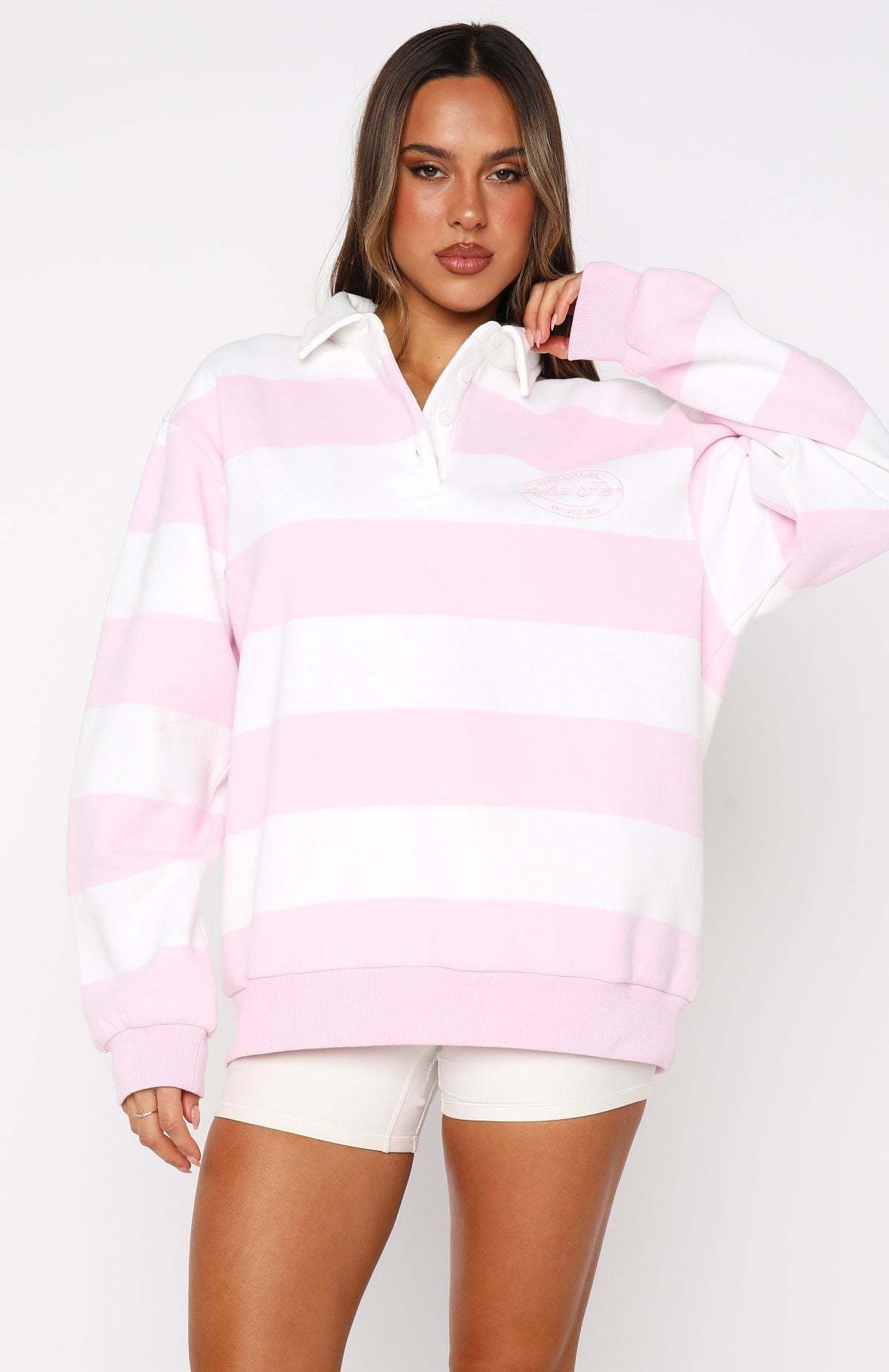 Stay cozy and stylish during your workouts with the Moving Fast Oversized Henley Sweater in Ballet Pink. Featuring a collar neckline, button placket, and drop shoulders, this sweater offers a oversized silhouette. Long sleeves with ribbed cuffs and a ribbed hemline add structure, while the fleece interior provides warmth. The embroidered White Fox logo on the side front adds a playful touch. Pair it with a matching active set for a coordinated look.