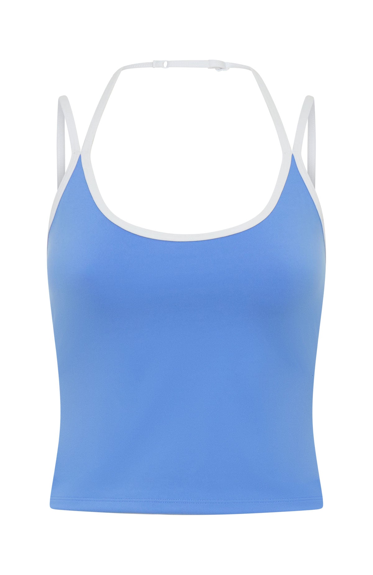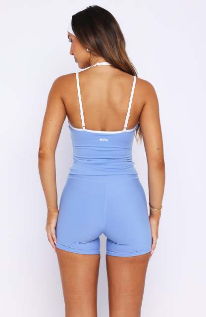Made to flatter! Our Power Boost Active Tank Blueberry/White features a double adjustable strap design with over the shoulders and halter neck, round neckline, built in bra with removable padding and signature WFA initials centre back. Pair with the matching shorts for a matching moment!