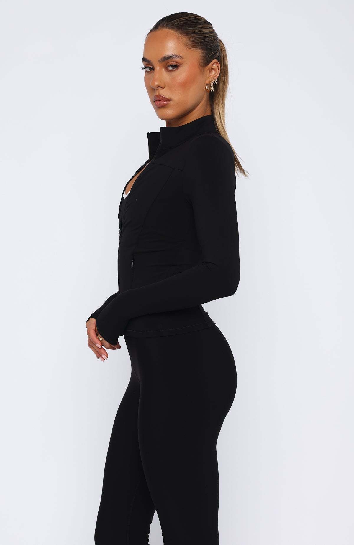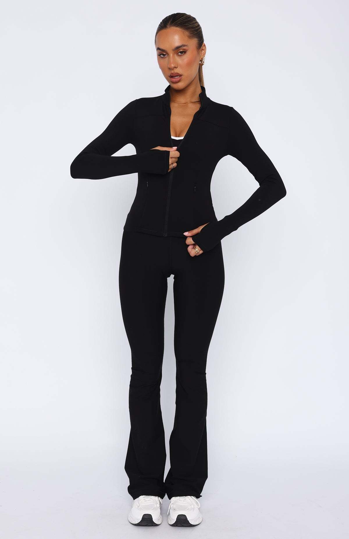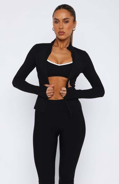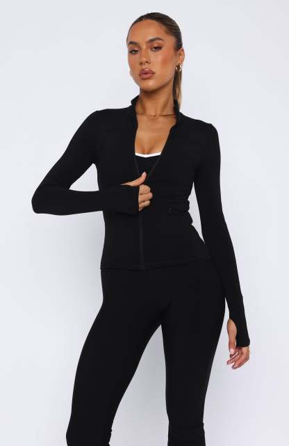Get ready to make a move in the Race To You Jacket Black! Features a super soft and breathable fabric, side zip pockets, contoured seams, full zip front, long sleeves with sewn in thumb holes and designed for a snug fit. Pair with the Go Getter High Waisted Leggings or layer with the I'll Prove It Sports Crop for a cute look during the cooler seasons.
