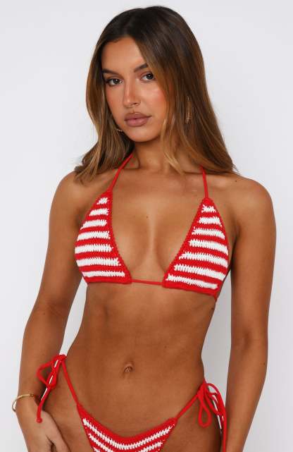 Cute and playful, the Shira Crochet Bikini Top Red/White Stripe is perfect for sunny days! Featuring a triangle bikini design, adjustable self tie closure, no padding and crotchet material. Pair with the matching Shira Crochet Bikini Top Red/White Stripe and Miss America Crochet Mini Skirt Red/White Stripe for a look we love!