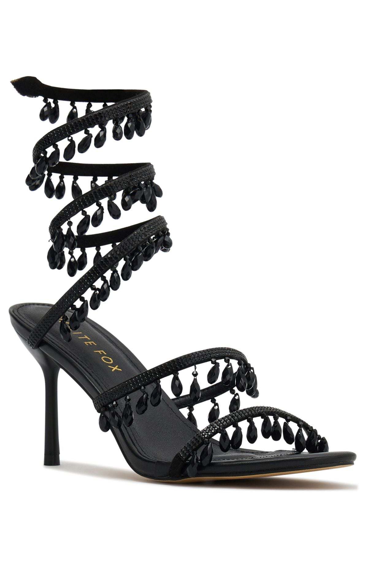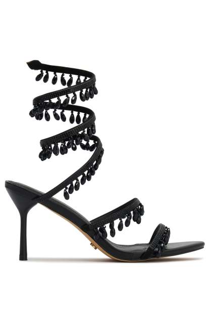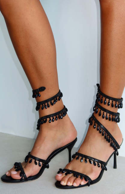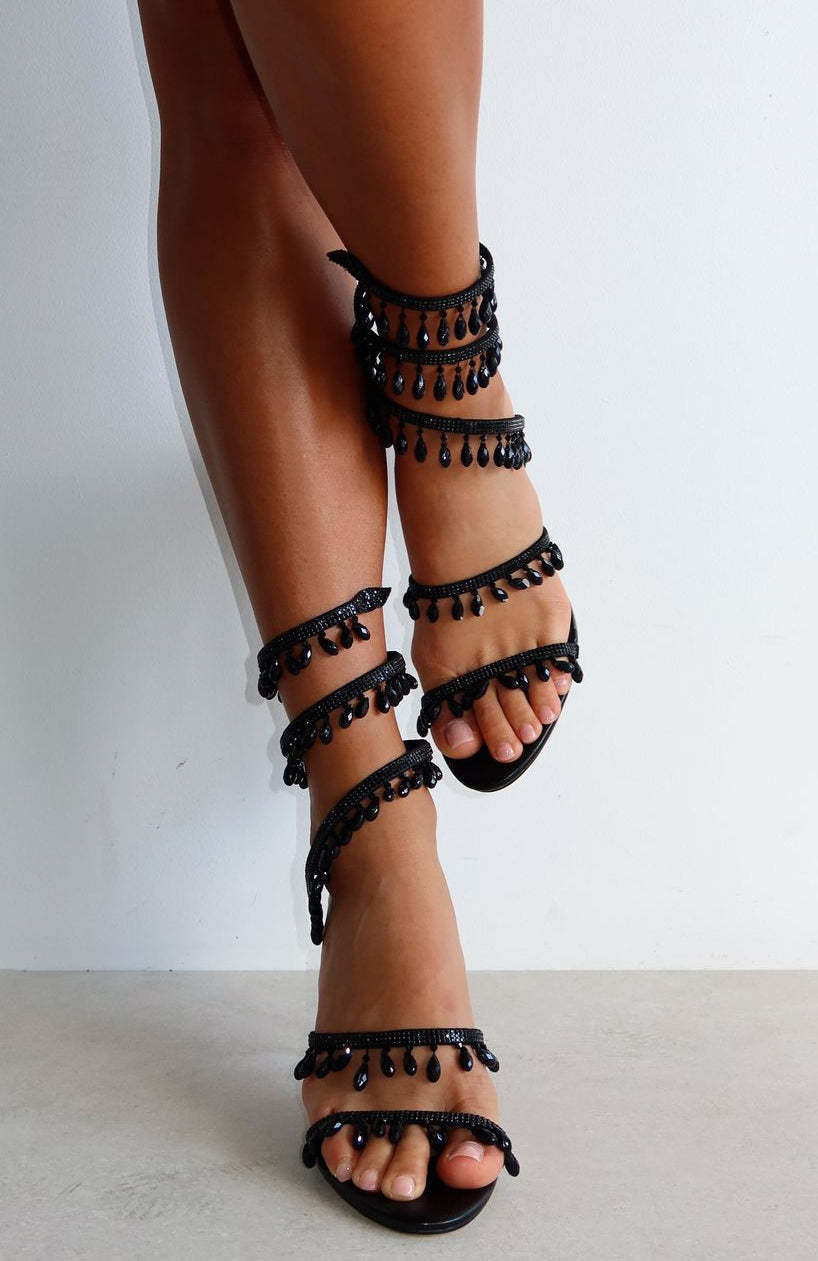 Add a touch of sparkle in the Soliel Wrap Heels Black! Features an open ROUND toe, two toe straps and wrapped ankle strap with crystal detailing providing a sense of elegance. We are obsessed.