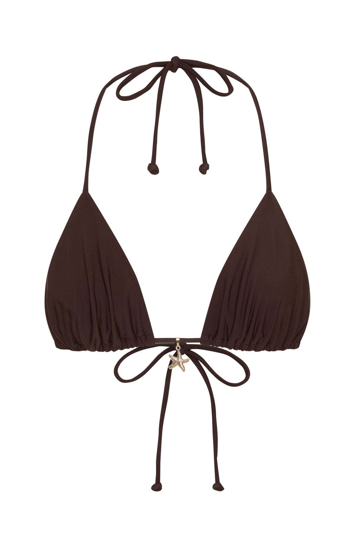 No shoes no shirt just the Sunset Bay Bikini Top Espresso, no problem! Featuring self-tie halter straps, a classic triangle silhouette, and an adjustable back strap for a tailored fit. Finished with a delicate shell-gold charm at the front for a touch of seaside sparkle. Style it with the matching Espresso bottoms and layer on gold jewellery for that golden-hour summer glow.