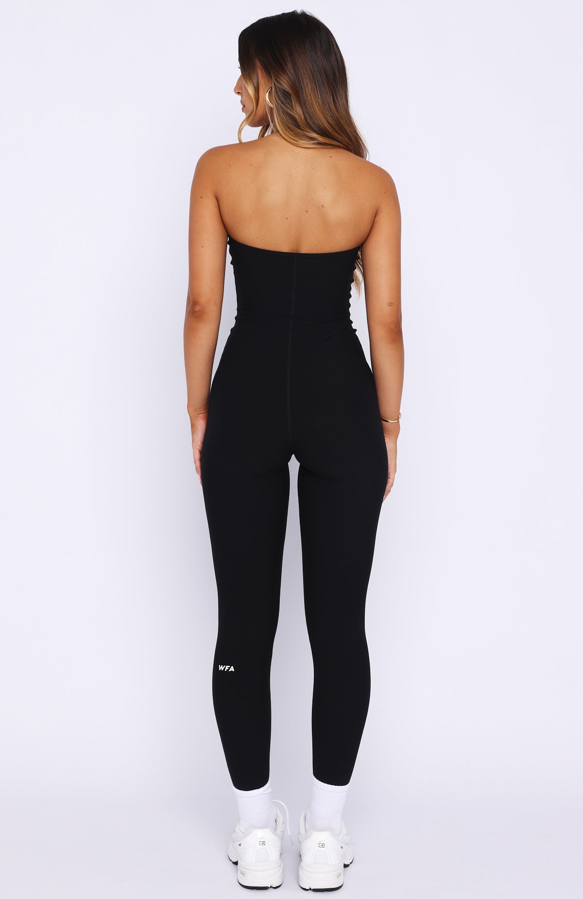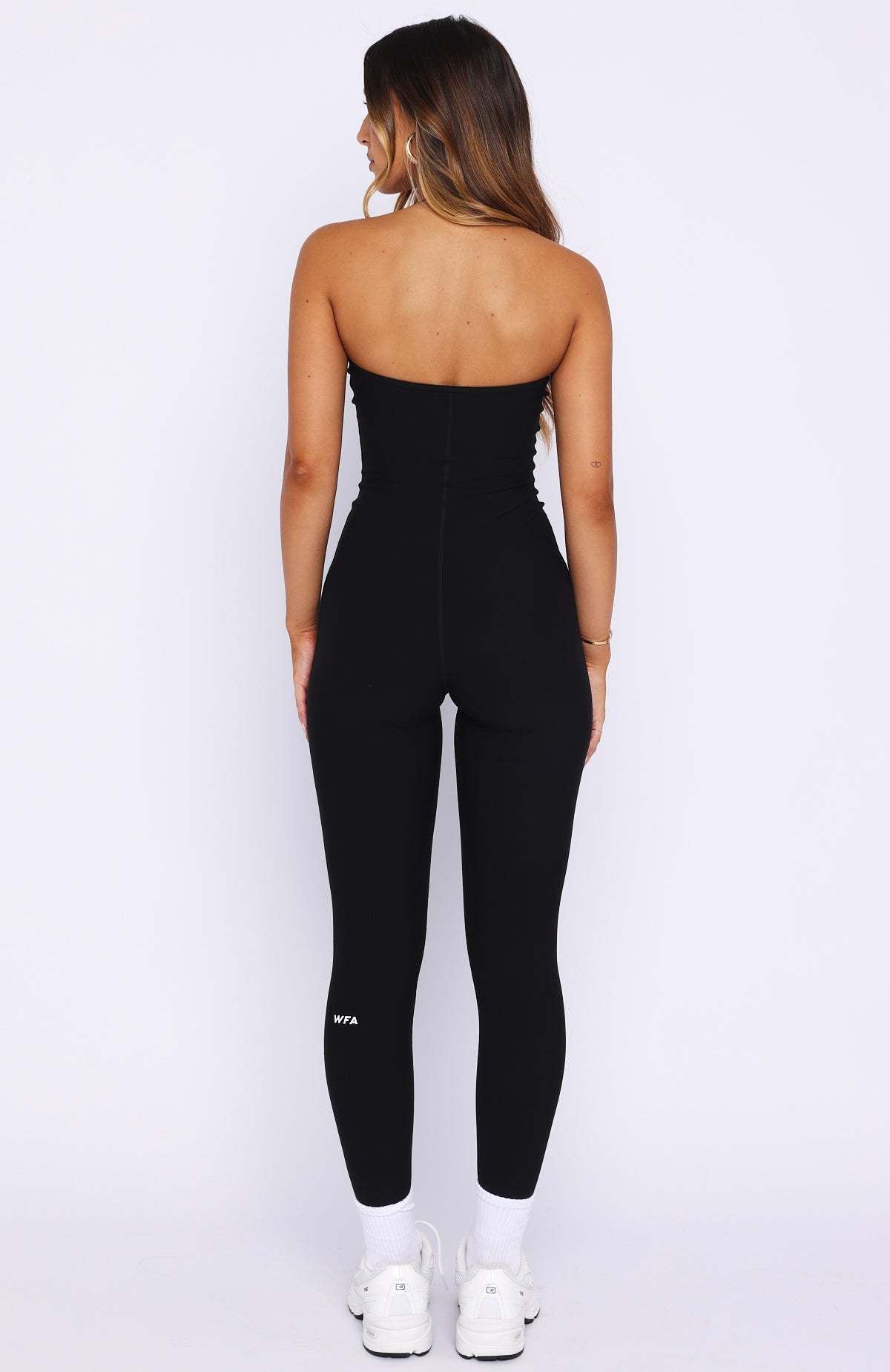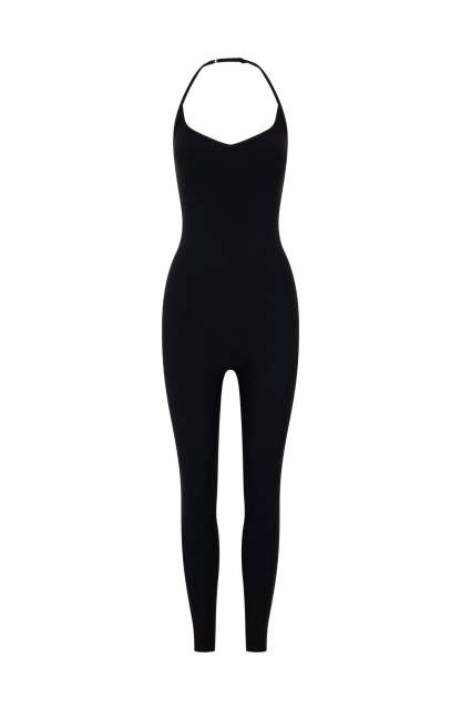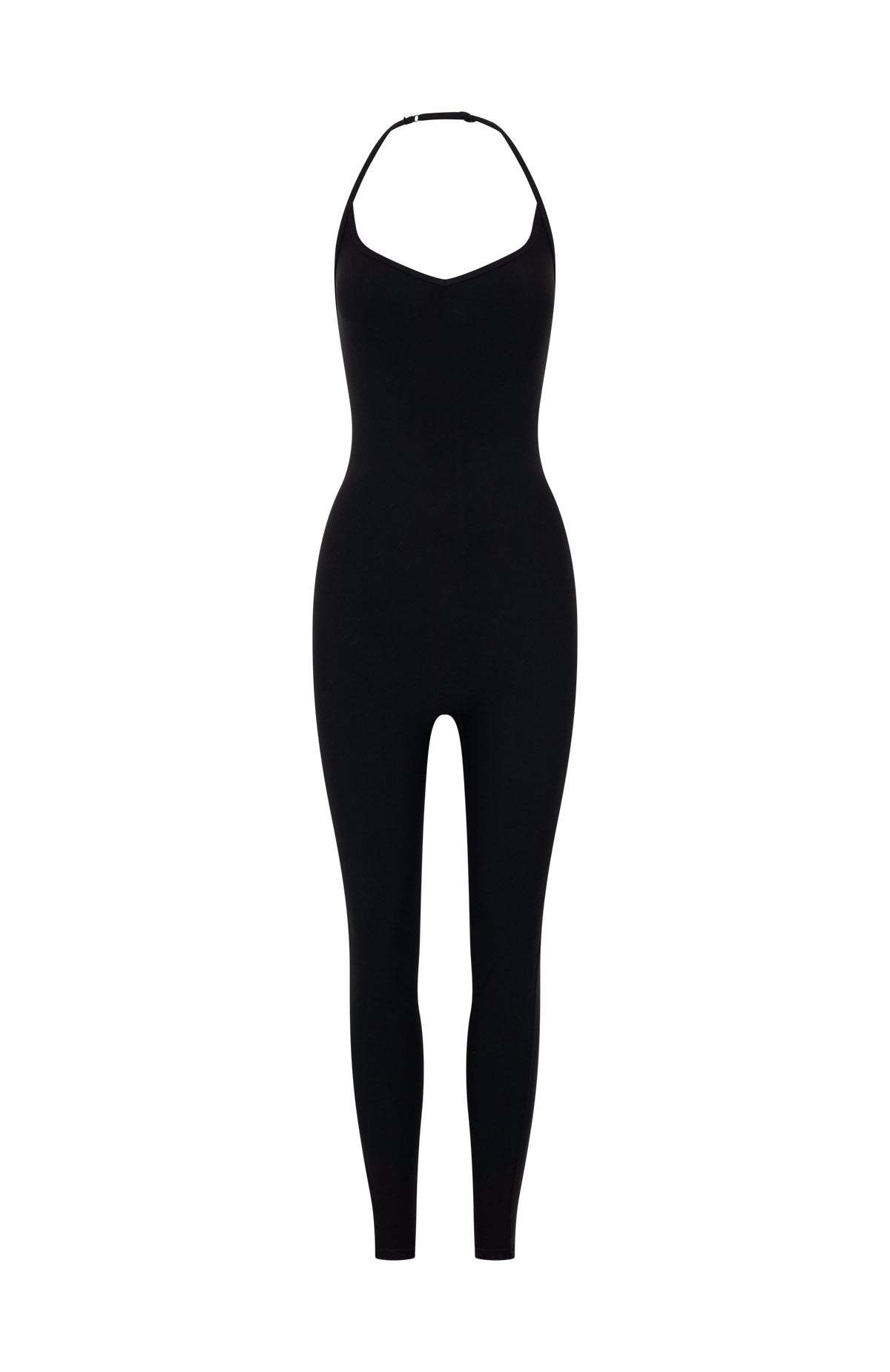 Stretch, strengthen and slay in the Swift Jumpsuit Black. Crafted in high stretch fabrication this jumpsuit features fixed halter with an adjustable strap, a flattering scoop neckline with a subtle V-curve, and internal under-bust elastic for gentle support. The fitted silhouette hugs curves, while the open back adds a bold edge. Style with socks and sneakers for a sleek, gym-ready look.