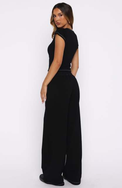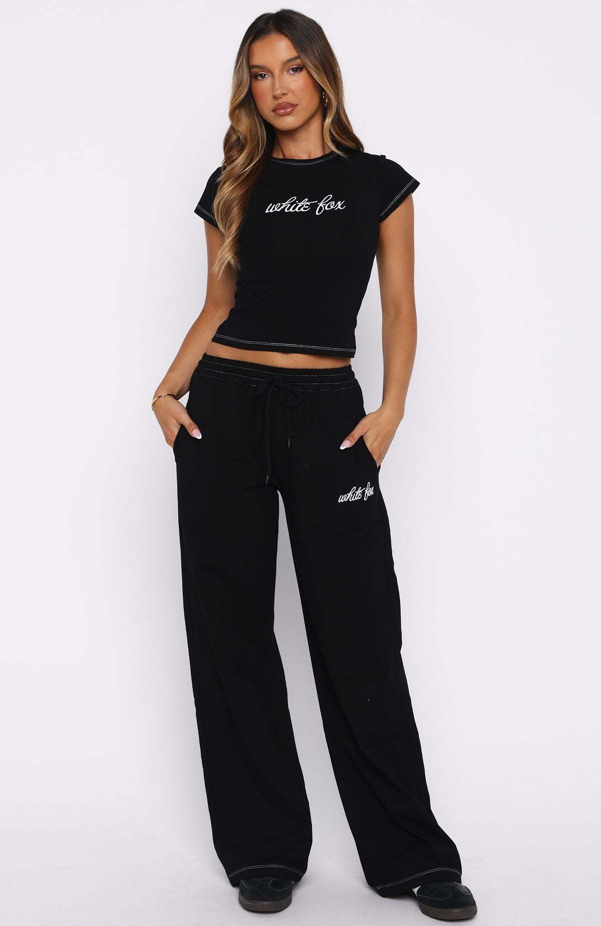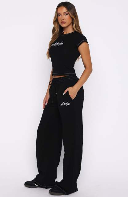 The Original Track Pants Black are designed for easy days. Featuring an elasticated waistband with drawstring, wide leg design, side pockets and unlined material, finished with a logo embellishment on the front side leg. Pair with the The Original Baby Tee for the cutest lounge look ever!