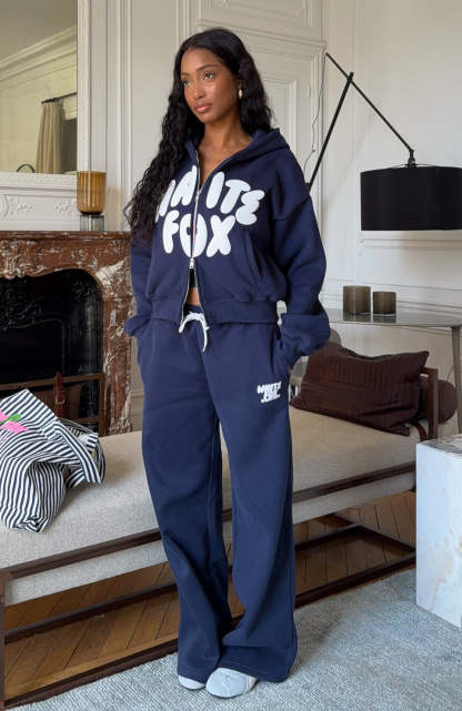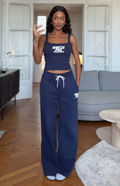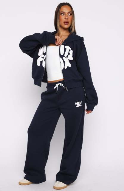 Getting chilly! The Club 14 Allie Wide Leg Sweatpants Navy features a thick elasticated waistband with contrast-colour external drawstring, a wide-leg silhouette and oversized fit, practical side pockets and a bold White Fox puff-print logo. Style with the matching Club 14 Allie Boxy Zip Front Hoodie for the perfect blend of comfort and standout street-style appeal.