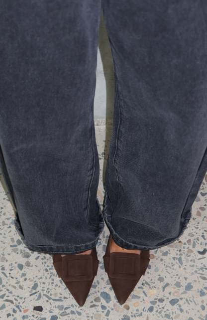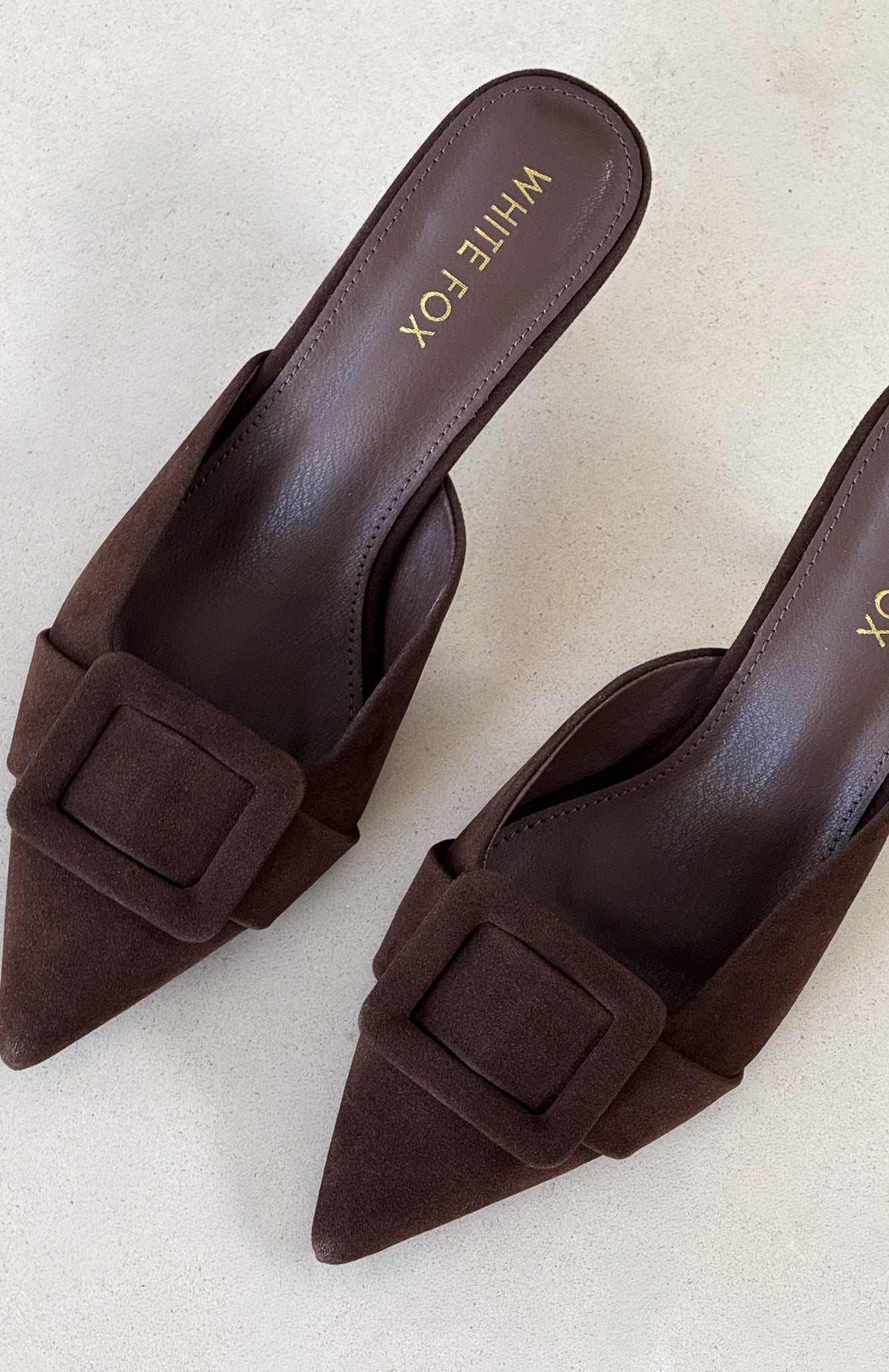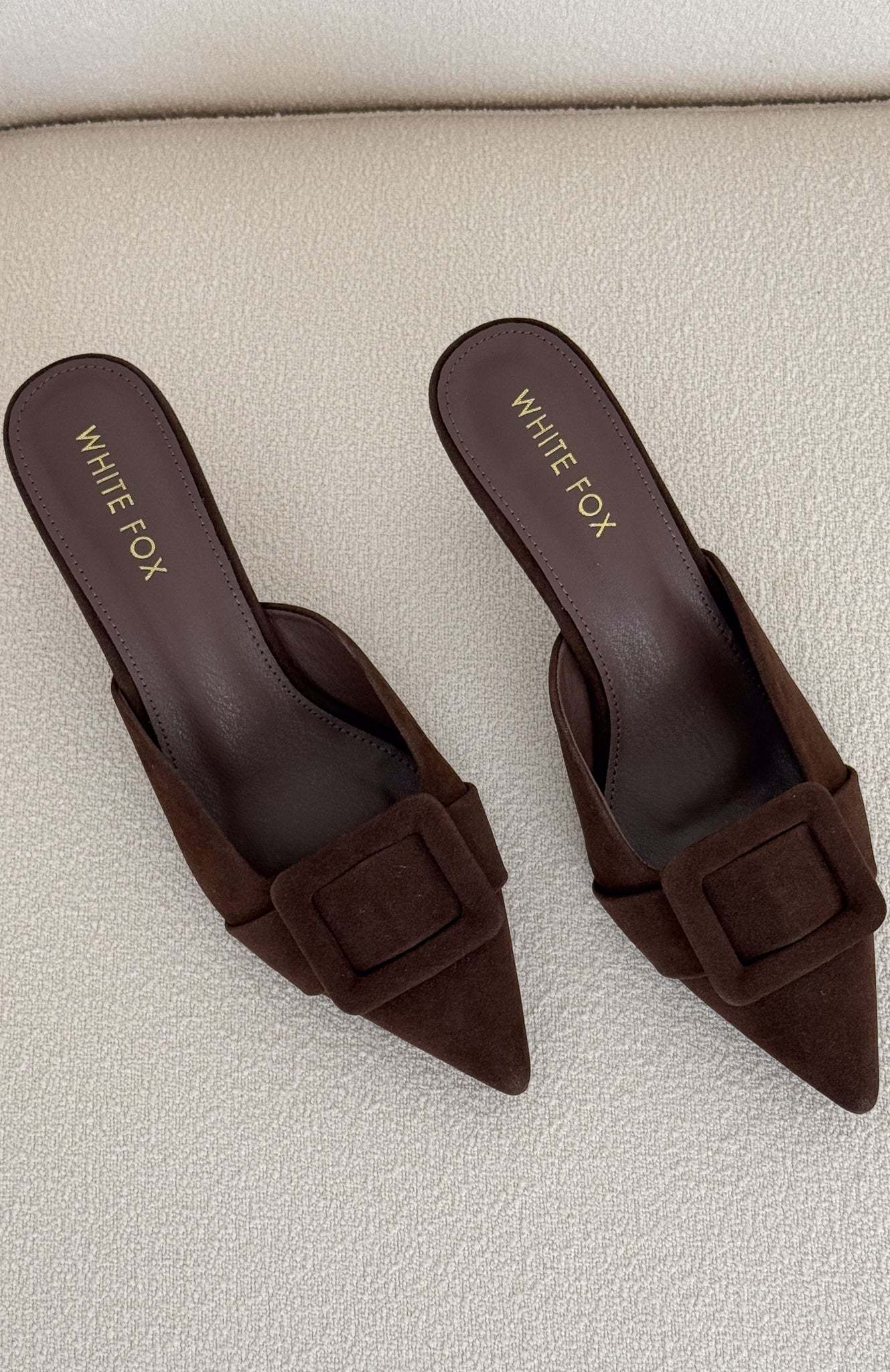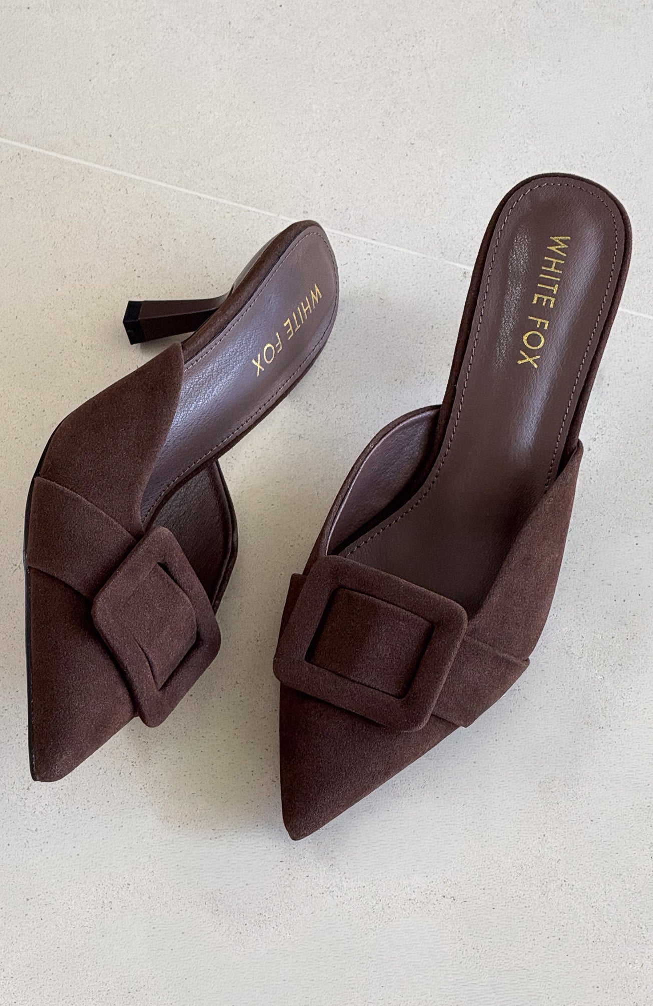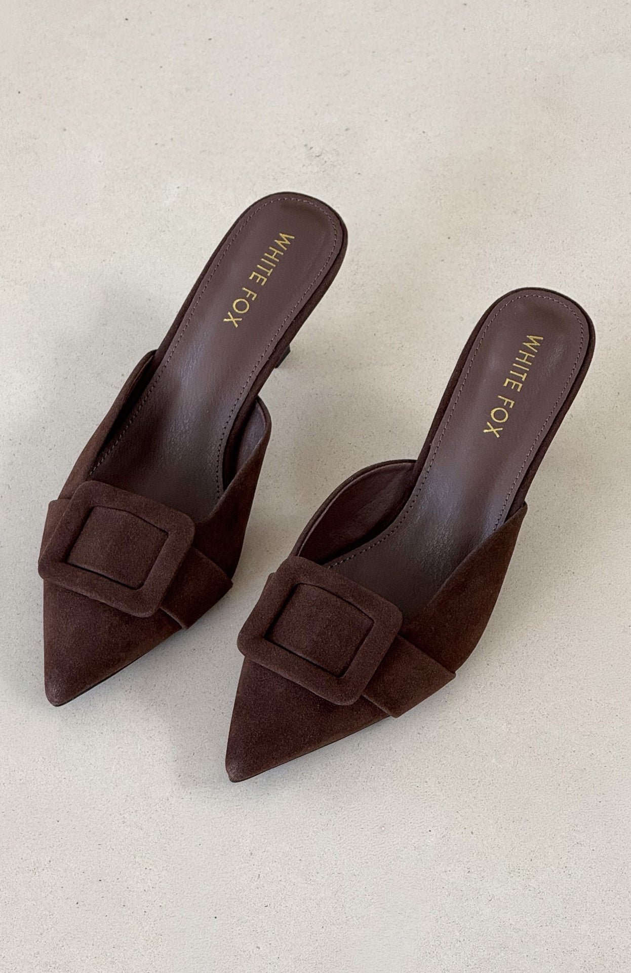 The ones who know, wear them. The Domino Heels in Chocolate Faux Suede feature a pointed closed toe, open round heel, and an oversized buckle at the front atop a chic kitten heel. Style them with denim and a statement top for an effortlessly elevated look.