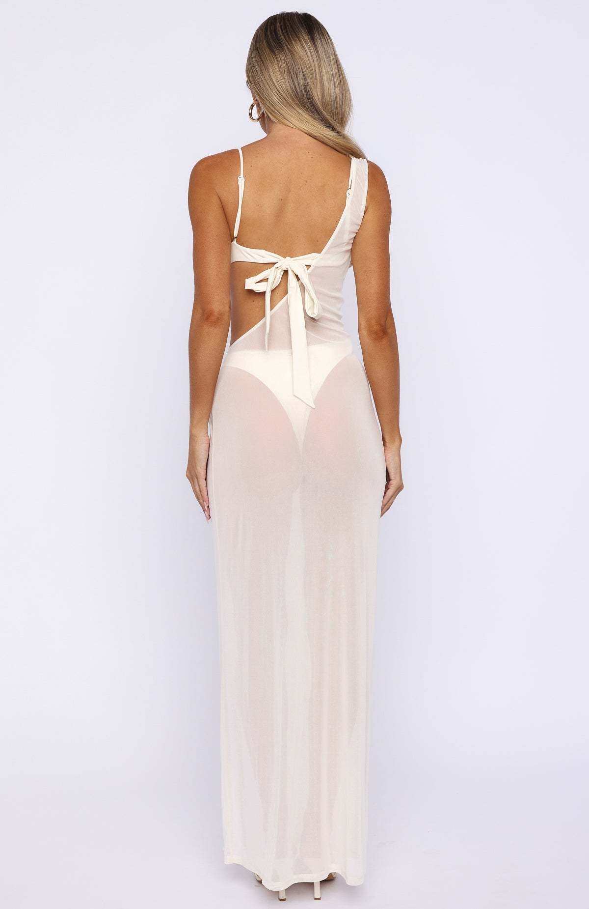 The Love In Bloom Swim Set in Cream pairs a dress-style cover-up with the one-piece for a chic layered look. The cover-up has a thick shoulder strap, one-shoulder neckline, gold hardware at the hip, sheer fabric, and a high side leg split. The one-piece features thin adjustable straps with pearl detailing, a sweetheart neckline, under-bust wire and padded bust, a curved bodice, thick self-tie back straps with an open back, cheeky coverage, and White Fox gold hardware at the back. Style it with sandals and simple gold jewelry for effortless bridal glamour.