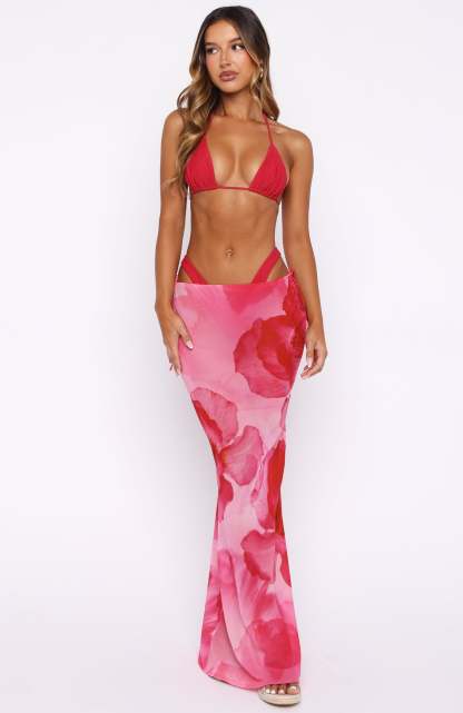 In a love affair with the Luminous Maxi Skirt in Savage Bloom! Features side cut out design, self ties for a desirable fit and semi sheer fabrication. Complete the look with a bikini set in Savage Bloom, kitten heels and gold accessories for the perfect beach club fit.