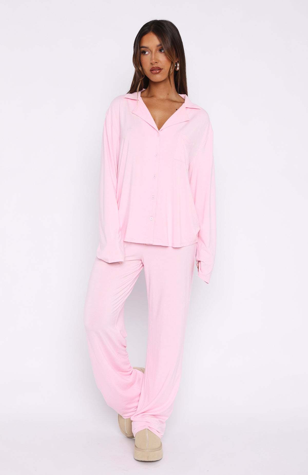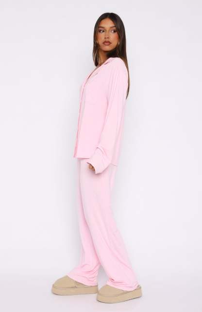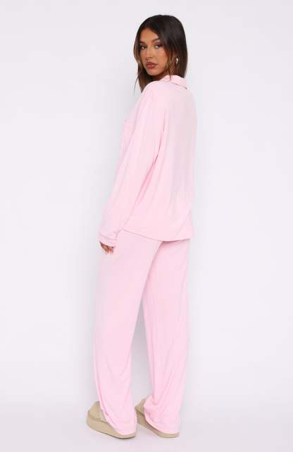 Cosy up in the pyjamas you won't be taking off this winter season! The Pillow Talk Long Sleeve Pyjama Set Baby Pink features a high stretch, soft fabric, lapel neckline, long sleeves, front button closure, elasticated waistband and lined fabric. Pair with your go-to uggs and sleep tight!