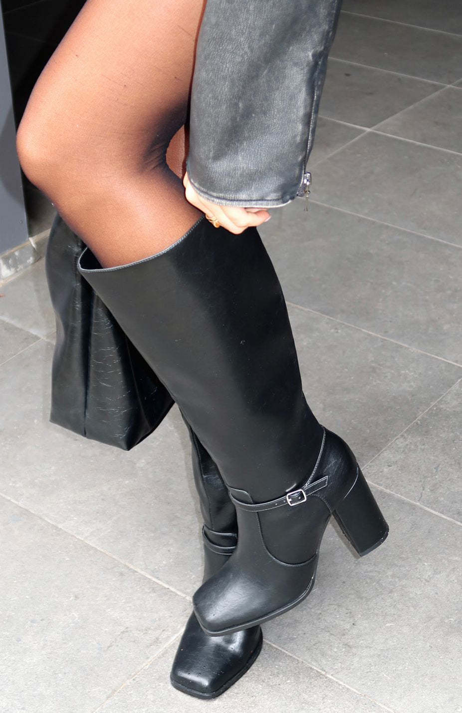 Feel chic in the Presley Boots in Black Crinkle! Features a square toe, chuncky heel, belt buckle detailing and zipper. These boots pair perfectly with mini skirts and bomber jackets for a girl night fit!