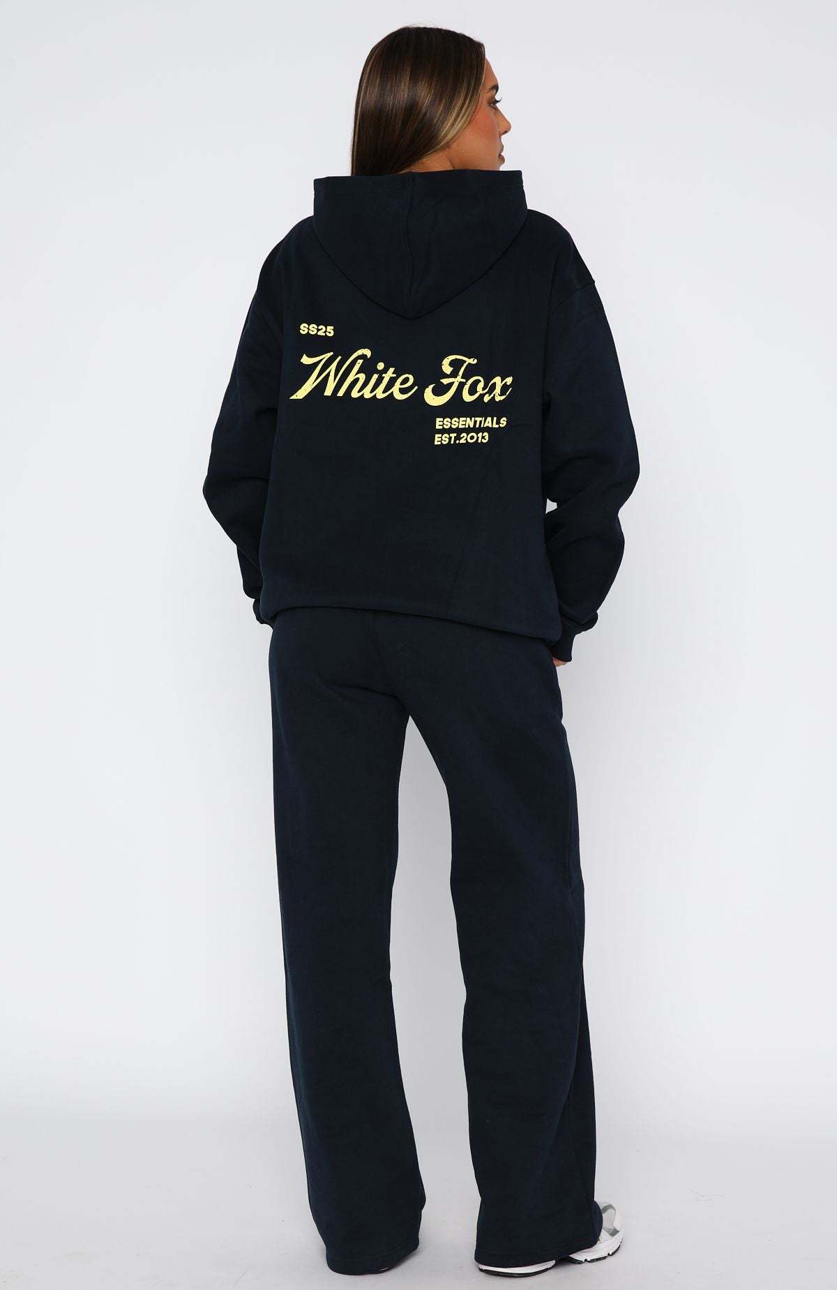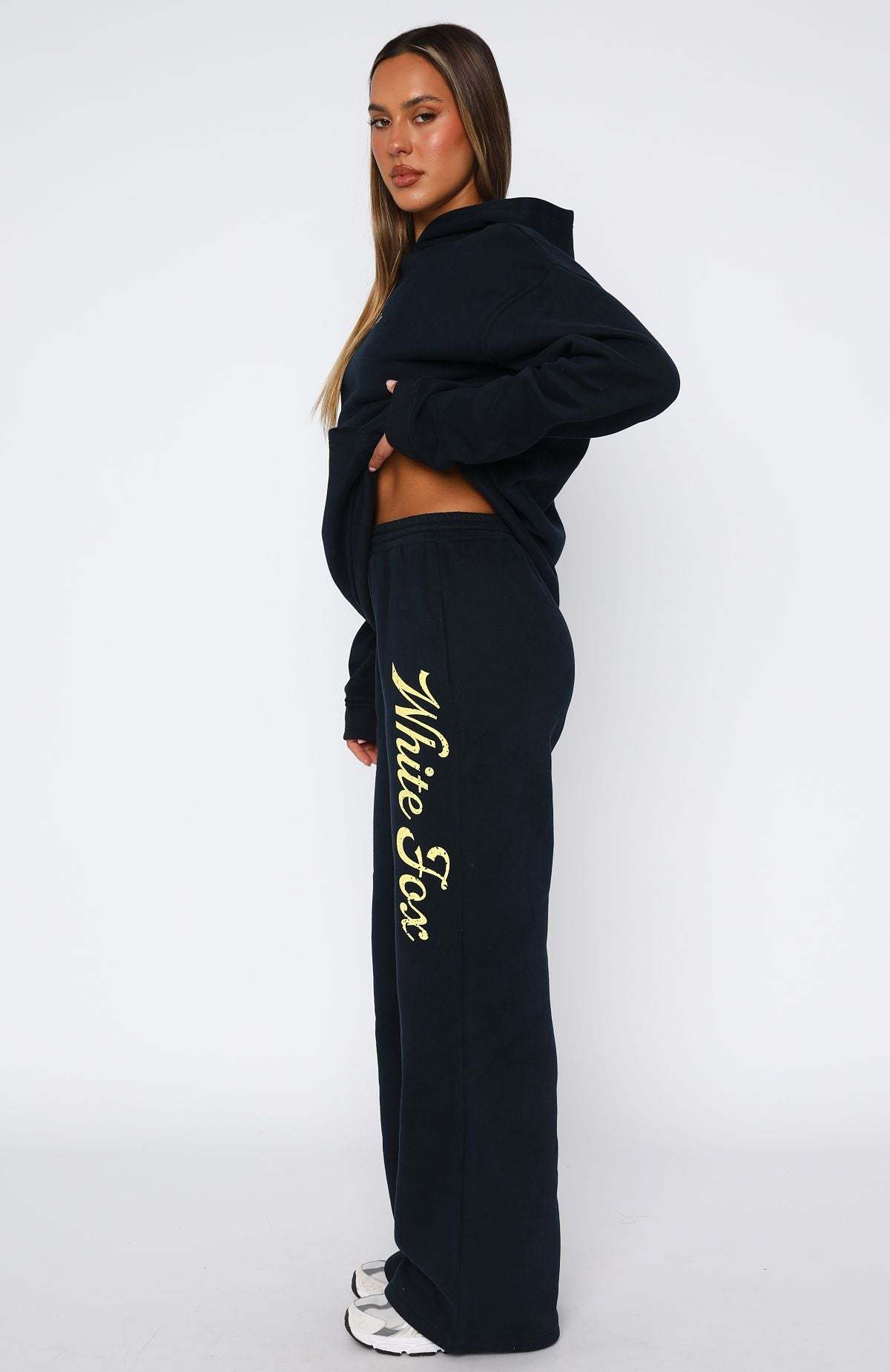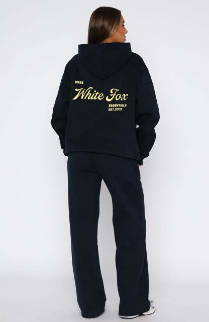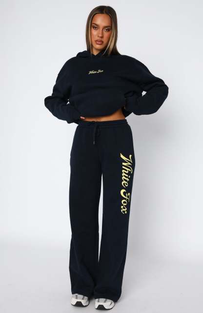 Experience cosy life in the The Good Life Wide Leg Sweatpants in Navy. Features thick waistband with external drawstring ties, side pockets, wide leg fit, internal fleece fabrication and White Fox text side front. Complete the look the matching The Good Life Back Graphic Oversized Hoodie in Navy.